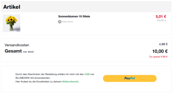 Blume2000 verkauft an alle Neukunden eben mal schnell 10 Sonnenblumen für nur 10€ inklusive Versand. (regulärer Preis: 19,98€) Ersparnis ~10€