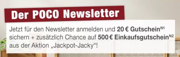 Gültig vom 13.09. bis 19.09.2025 in allen POCO-Märkten und im Onlineshop. Bei Ihrem Einkauf gewährt Ihnen POCO auf Boxspringbetten, Polsterbetten, Matratzen und Lattenrahmen einen Rabatt in Höhe des Mehrwertsteueranteils, der auf den im Laden ausgezeichneten Preis anfallen würde. Der Mehrwertsteueranteil entspricht einer Minderung von 15,97% des jeweiligen Kaufpreises. Beispiel: der Verkaufspreis ist 100 €, der Wert der MwSt. ist 19%, sie sparen 15,97€! Allerdings kann Poco aus gesetzlichen Gründen dem Kunden nicht die Mehrwertsteuer als solche erlassen. Auf dem Kassenbon wird daher weiterhin eine Mehrwertsteuer ausgewiesen, welche sich auf den reduzierten Betrag bezieht. Der Kunde ist nicht berechtigt, die Erstattung des auf dem Kassenbon ausgewiesenen Mehrwertsteueranteils zu verlangen. Gilt nicht für im Prospekt abgebildete Artikel, „nur Online“ Artikel, „Hot Deal“ Artikel und nicht für mit „Werbung“ gekennzeichnete Artikel. Gilt nicht für bereits reduzierte Artikel. Gilt nicht für Lieferkosten. Nicht kombinierbar mit anderen Rabattaktionen. Gilt nur für Neuaufträge.