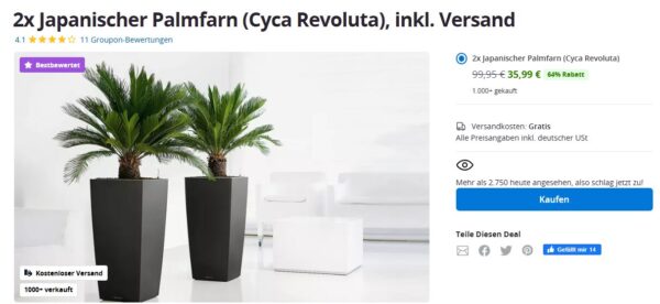 Bei Groupon gibt es 🌴 2x Japanische Sagopalmen (Cyca Revoluta, 45-60cm)