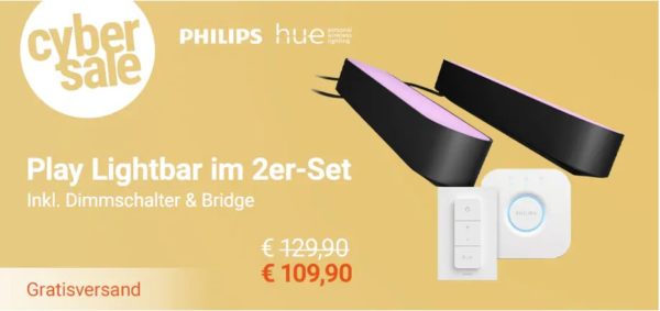 Bei Cyberport bekommt ihr 2x Philips Hue Play Lightbar inkl. Netzteil, Bridge & Dimmschalter V2 für 109€ (Vergleichspreis ~163€) Ersparnis ~54€