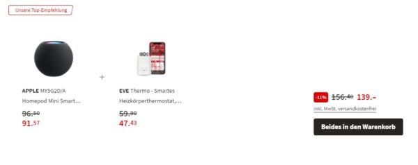 - Apple Homepod (MY5G2D/A) & Eve Thermo (smartes Heizkörperthermostat) für 129€ (Vergleichspreis: ~155€) Ersparnis ~26€