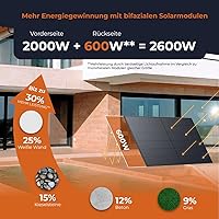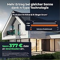 - Maximale Power – Um auch bei schlechten Wetterverhältnissen möglichst lang 800 Watt zu erzeugen! Trotz der hohen Solarmodul-Leistung ist die Anlage genehmigungsfrei, da der Wechselrichter auf 800W gedrosselt werden kann. Sollte Sie wünschen den Wechselrichter auf 2000W Ausgangsleistung zu betreiben, können Sie das in der App einstellen.