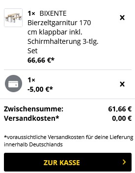 Krass! 😀 Bei SportSpar erhaltet ihr derzeit die Bixente Bierzeltgarnitur (3-tlg.) für 66,66€ 🙂 Es lassen sich aber nochmal 5€ sparen! (Vergleichspreis: ~85€) Ersparnis bis zu 23€