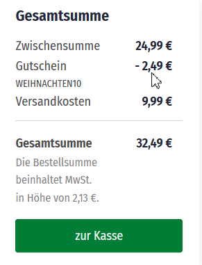 Die Lieferkosten betragen 9,99€ und mit dem Gutscheincode: WEIHNACHTEN10 spart man nochmal 10%.