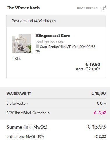 Bei Mömax bekommt ihr gerade den Hängesessel Karo zur Deckenmontage für 13,93€ (Vergleichspreis ~30€) Ersparnis ~16€