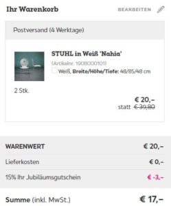 - Legt einfach zwei Stück in den Warenkorb und gebt den Gutscheincode Jubel15 ein.