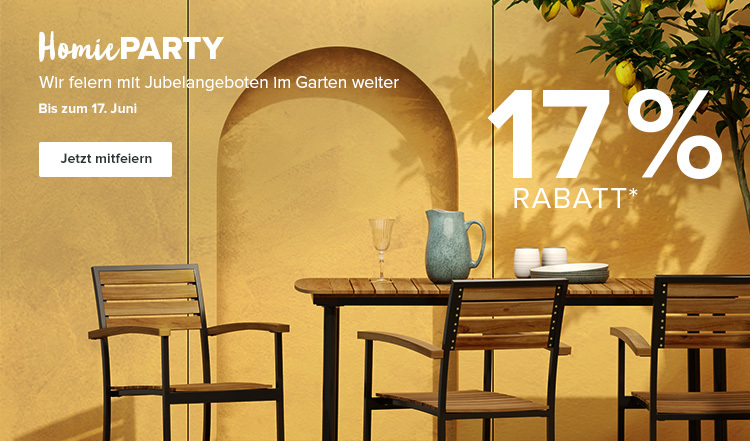 Gutscheincode im letzten Schritt der Bestellung eingeben. Mindesteinkaufswert 100 €. Gilt nur für alle Produkte der Aktionsseite „Homie Party“. Gutschein mehrmals einlösbar. Nicht mit anderen Aktionen kombinierbar. Gültig bis zum 17.06.2019.