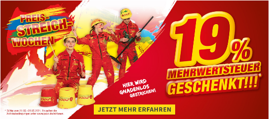 Bei Ihrem Einkauf gewährt Ihnen POCO einen Rabatt in Höhe des Mehrwertsteueranteils, der auf den im Laden ausgezeichneten Preis anfallen würde. Der Mehrwertsteueranteil entspricht einer Minderung von 15,97% des jeweiligen Kaufpreises. Beispiel: Der Verkaufspreis ist 100 €, der Wert der MwSt. ist 19%, Sie sparen 15,97€! Allerdings kann POCO aus gesetzlichen Gründen dem Kunden nicht die Mehrwertsteuer als solche erlassen. Auf dem Kassenbon wird daher weiterhin eine Mehrwertsteuer ausgewiesen, welche sich auf den reduzierten Betrag bezieht. Der Kunde ist nicht berechtigt, die Erstattung des auf dem Kassenbon ausgewiesenen Mehrwertsteueranteils zu verlangen. Ausgenommen bereits reduzierte Artikel. Nicht mit anderen Rabattaktionen kombinierbar. Gültig vom 22.05.-28.05.2021 in allen POCO Märkten, vorbehaltlich geöffneter Ladengeschäfte, und im Onlineshop. Gilt in den Märkten nicht für die im Prospekt beworbene Ware. Nicht kombinierbar mit anderen Rabattaktionen, gilt nicht für „nur Online“ Artikel. Gilt nur für Neuaufträge.