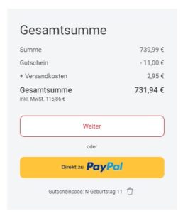 Nutzt den Gutschein N-Geburtstag-11 und schon kommt ihr auf den Preis.