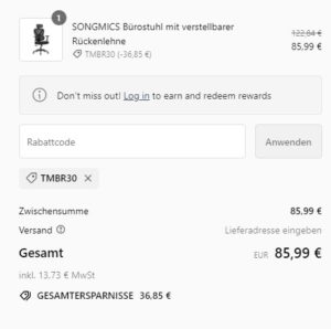 Bei Songmics erhaltet ihr bis maximal 18. April den SONGMICS Bürostuhl (4-stufig verstellbare Rückenlehne, 120kg) für 85,99€ (Vergleichspreis: ~123€) Ersparnis ~37€