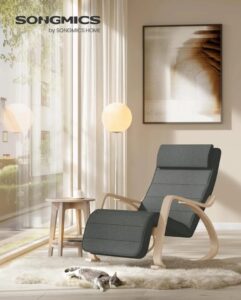 Der SONGMICS Schaukelstuhl (Modell LYY10G) ist ein kompakter und bequemer Entspannungssessel für den Innenbereich. Er kombiniert eine sanfte Schaukelbewegung mit einer 5-Positionen verstellbaren Fußstütze und bietet einen gemütlichen Platz zum Lesen, Napping oder einfach Entspannen.