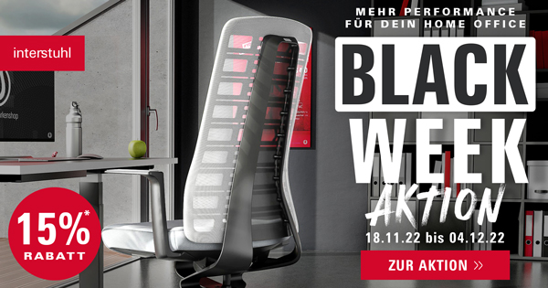 Aktionsbedingungen: Rabatt anwendbar auf Interstuhl ACTIVE Editionen im Zeitraum 18.11.–4.12.22 mit dem Code BLACKWEEK22 im Markenshop auf shop.interstuhl.com. Die Aktion ist nicht mit anderen Rabatten kombinierbar. Lieferung und Rücksendung in Deutschland kostenfrei.