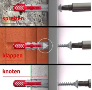 - Ein Dübel für alle Baustoffe: Als intelligenter 2-Komponenten-Dübel ist er mit Schrauben Ø 6 – 8 mm verwendbar und bietet er sehr gute Haltewerte – die graue Komponente aktiviert je nach Baustoff automatisch das optimale Funktionsprinzip, während die Expansionsflügel der roten Komponente die sichere Verspreizung unterstützen