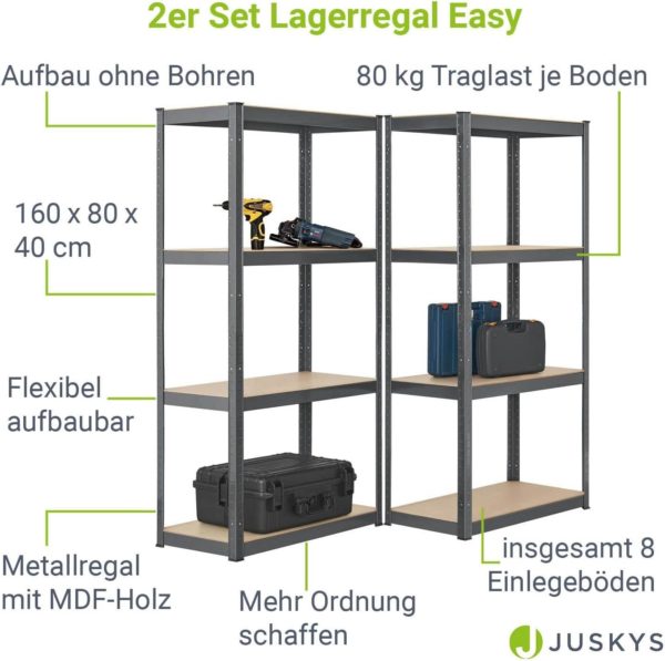 - Mehr Ordnung: Mit dem 2er Lagerregal Set Easy bringen Sie Ordnung in Keller, Garage, Werkstatt, Lager oder Abstellkammer. Ideal zur Aufbewahrung von Gartenzubehör, Werkzeug, Vorräte, Getränke oder Aktenordner.