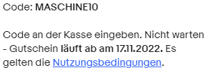 Um auch auf den Preis zu kommen, müsst ihr den Gutschein-Code MASCHINE10 verwenden.