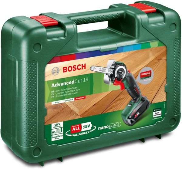 - Lieferumfang: AdvancedCut 18, Nanoblade Wood Speed 65 mm, 1x 2,5 Ah Akku, Ladegerät AL 1830, transparente Sägeblattschutzabdeckung, Aufbewahrungsschlaufe, Koffer
