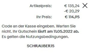Nutzt den Gutschein SCHRAUBER15 und schon erhaltet ihr den Preis.