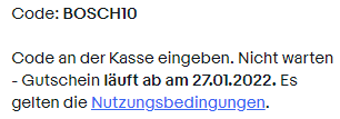 Um auch auf den Preis zu kommen, müsst ihr den Gutschein BOSCH10 verwenden.