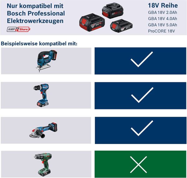 - AMPShare: Akkus und Ladegeräte sind vollständig mit dem Bosch Professional 18V System sowie mit vielen anderen Werkzeugen der Marken aus der Akku-Partnerschaft AMPShare kompatibel