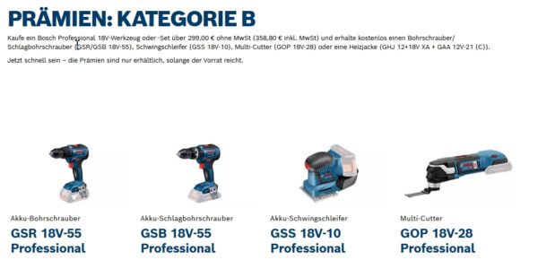 Da es sich bei dem Deal um ein Professional Werkzeug handelt, gibt es außerdem noch eine Zusatzprämie wie z.B. einen Akkupack oder weitere Produkte (Link)
