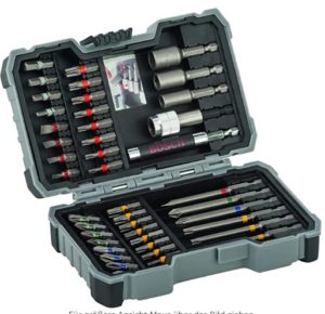 - Lieferumfang: 32 x Schrauberbits Länge 25 mm (4 x Kreuzschlitz PH 1/2/2/3, 4 x Pozidriv PZ 1/2/2/3, 4 x Schlitz S 3/4/5/6, 8 x Torx T 10/15/20/20/25/27/30/40, 8 x Sicherheits-Torx Th 10/15/20/20/25/27/30/40, 4 x Hex H 3/4/5/6), 6 x Schrauberbits Länge 50 mm (1 x Kreuzschlitz PH 2, 1 x Pozidriv PZ 2, 1 x Schlitz S 5, 3 x Torx T 15/20/25), 3 x Steckschlüssel Ø 6/8/10 mm, 1 x Universalhalter magnetisch mit Quick-Change-Funktion, 1 x Universalhalter magnetisch
