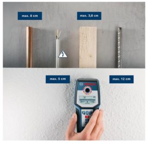 Das GMS 120 verfügt über eine fortschrittliche Sensortechnologie, die es ermöglicht, Metall, Holz, stromführende Leitungen und andere Objekte in einer Tiefe von bis zu 12 cm zu erkennen. Dadurch wird vermieden, dass man versehentlich in Leitungen bohrt oder auf Metallstangen stößt.