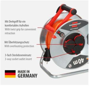 - Kabeltrommel 40m outdoor mit Überhitzungsschutz für mehr Sicherheit und einer Leistung im aufgerollten Zustand von 230V: 1000W und im abgerollten Zustand von 230V: 3300W