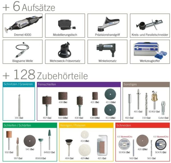 - LIEFERUMFANG: 1x Dremel 4000,45x Zubehöre, 1x Biegsame Welle