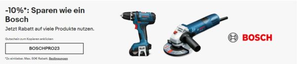 Bei ebay ist gerade eine neue Aktion gestartet bei der ihr 10% Rabatt auf ausgewählte Bosch Werkzeuge bekommt