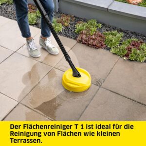 - Inklusive Home Kit: Mit dem Flächenreiniger T 1 und dem Reinigungsmittel „Stein- und Fassadenreiniger“ können größere Oberflächen wie Wege oder Terrassen bequem gereinigt werden