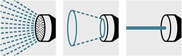 - Drei stufenlos einstellbare Sprühbilder: Brause, Punkt- und Kegelstrahl