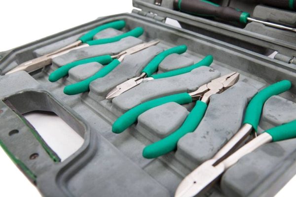 - 5 Zangen: Telefonzange 160mm + 125mm, Seitenschneider 150mm+115 mm, Kombizange 120mm