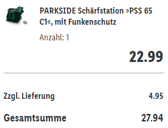 Denn bei LIDL bekommt man die Parkside Schärfstation PSS 65 C1 (mit Funkenschutz) für 27,94€ (Vergleichspreis: ~37€) Ersparnis ~9€