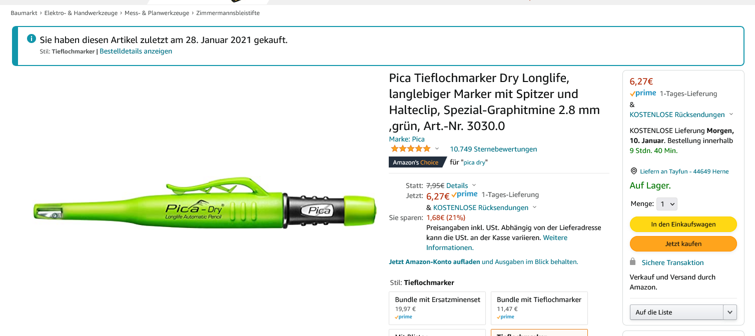 Bei Amazon gibt es für unbestimmte Zeit den Pica Tieflochmarker für 6,27€ (Vergleichspreis: ~10€) Ersparnis ~4€