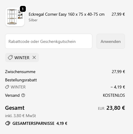 Bei Juskys gibt es ein Schwerlast-Eckregal Corner Easy 160 x 75 x 40-75 cm für 23,79€ inklusive Versand.