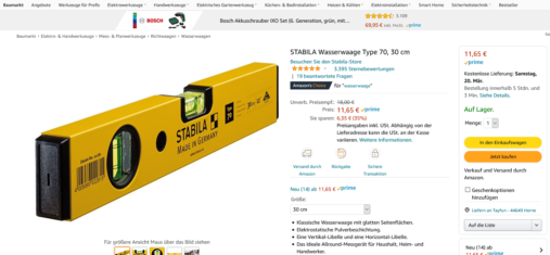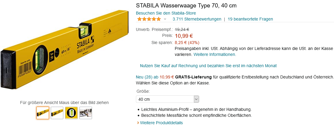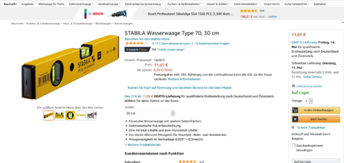 Bei Amazon kommt ihr für unbestimmte Zeit die STABILA Wasserwaage Type 70, 30 cm für 11,69€ (Vergleichspreis ~15€) Ersparnis ~3€