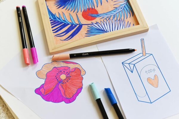 - Wasserlösliche Filzstifte die nicht austrocken und bis zu einem Monat ohne Kappe aufbewahrt werden können (außer schwarz).