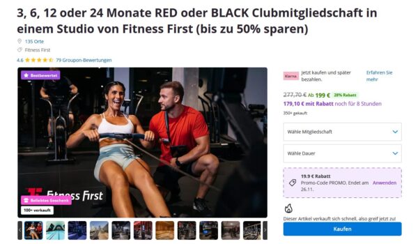 Bei Groupon bekommt die Fitness First 3/6/12/24 Monate RED oder BLACK Mitgliedschaften mit bis zu 50% Rabatt.