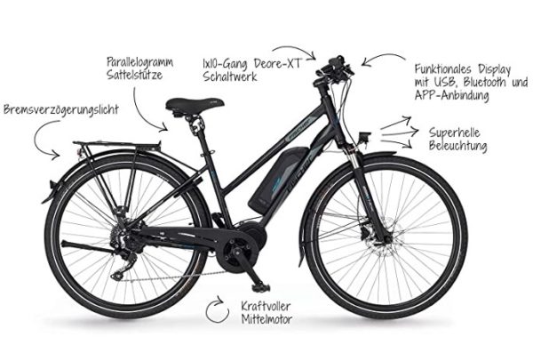 - 28 Zoll Reifen, Rahmenhöhe 49 cm. Alurahmen Trekking Damen mit hydroverformten Hauptrohr und semi-integriertem Akku für ein verbessertes Fahrverhalten, Gewicht von 26 kg, davon entfallen 3,3 kg auf den Akku, zulässiges Gesamtgewicht von 150 kg