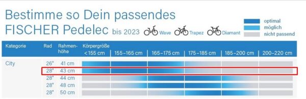 Die Rahmenhöhe ist mit 43cm angegeben, laut Liste von Fischer gut für Menschen zwischen 155cm bis maximal 175cm.
