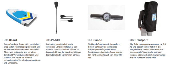 - Eigenschaften: Schneller und einfacher Aufbau. Hohe Stabilität durch 2600 gr/qm Drop Stitch Material. Einfache Handhabung durch Tragegriff und extrem geringes Gewicht von nur 4,8 Kg. Kurze Aufpumpdauer von ca. 5 Minuten durch Doppelhubpumpe – nur durch Erwachsene. Platzsparend, leicht transportierbar und verstaubar.