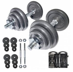 - Set bestehend aus 4×2,5kg, 4×1,25kg & 4×0,5kg Hantelscheiben und 2 Kurzhantelstangen