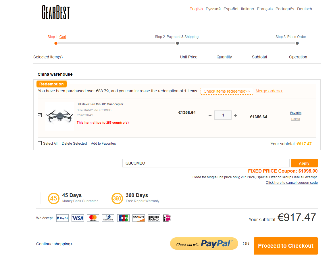 Peter1 (Gast) 15.01.2018, 18:37 #Habe mir die Mavic Platinum am 23.12. über GearBest zu 888 Euro bestellt. Geliefert wurde am 10.01. .
