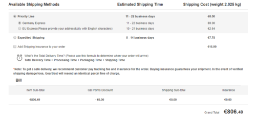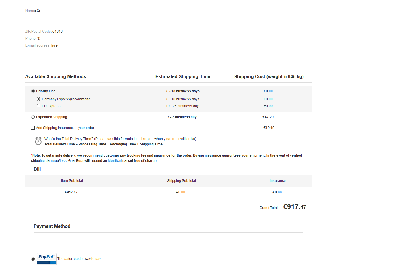 Marcel T. (Gast) 27.09.2017, 09:12 #@ASSAD Im Warenkorb wird mir 917,47€ angezeigt. Wenn ich dann mit Paypal zahlen möchte steht dort 917,48€, ich bestätige anschließend wieder bei Gearbest meine Adresse und dann wird mir bei Schritt 2: Bezahlung & Versand einfach 937,78€ angezeigt?! Ich habe keine Versicherung angehakt.