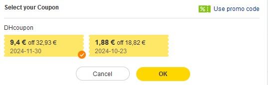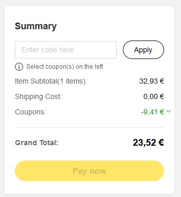 Clickt dazu aber noch zusätzlich in der Linken Ansicht auf „Select your Coupon“ und aktiviert den 9,40€ Gutschein!