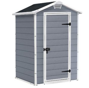 - Robuste doppelwandige Konstruktion, die allen Witterungsbedingungen standhält, inklusive Bodenplatte, die Gegenstände vom Untergrund fernhält, so dass sie sauber und trocken bleiben