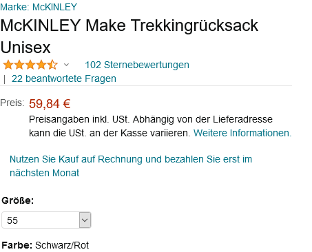 Bei Amazon gibt es für unbestimmte Zeit den McKINLEY Trekkingrucksack für 58,70€ (Vergleichspreis: ~78€) Ersparnis ~19€