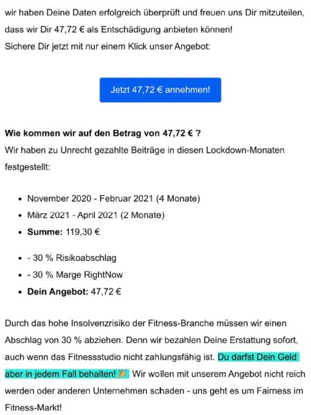 Hier zu sehen ist auch die Grundlage der berechnung. Eure zu unrecht gezahlten Gebühren abzüglich eines Risikoabschlags von 30% sowie eine 30% Marge für RightNow.