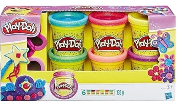 - Dieses 6er-Pack Play-Doh enthält Spielknete, die mit jeder Menge Glitzer gemischt ist sowie 2 Ausstecher in Schmetterlings- und Herzform