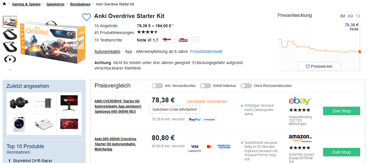 Matthi 26.04.2019, 07:11 #Heute als Tagesangebot bei iBood für 78,90€ zu bekommen: https://www.ibood.com/electronics-de/de/product-specs/48528/195751/anki-overdrive-starter-set.html